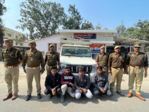 प्रतापपुर (देवरिया )पुलिस अधीक्षक महोदय जनपद देवरिया द्वारा अपराध एवम अपराधियों की रोकथाम व बिहार राज्य को होने वाले अबैध शराब व पशु तस्करी की रोकथाम हेतु चलाये गये अभियान ‘‘आप्रेशन शिकंजा’’ में दिये गये आदेश – निर्देश के क्रम में एवं श्रीमान् अपर पुलिस अधीक्षक महोदय ( दक्षिणी) के निर्देशन में व श्रीमान क्षेत्राधिकारी भाटपाररानी महोदय के कुशल पर्यवेक्षण में थानाध्यक्ष डॉ0 महेन्द्र कुमार थाना श्रीरामपुर जनपद देवरिया द्वारा गठित टीम के द्वारा आज दिनाक 06.02.2026 को सुबह 03.40 बजे के करीब बैकुण्ठपुर रामपुर प्रतापपुर चीनी मिल कालोनी के पास से मुखबीर खास की सूचना पर एक अदद चार पहिया वाहन महिन्द्रा बोलेरो पिकप में कुल 03 राशि गौवंशीय पशुओ को क्रूरता पूर्वक लादकर मैरवा के रास्ते सिवान बिहार ले जाने हेतु लादते हुए 04 नफर अभियुक्तगण क्रमश 01.हरेकृष्ण पुत्र रामअधार निवासी बंगरा बाजार थाना खामपार जनपद देवरिया उम्र 36 वर्ष, 02. छोटेलाल पटेल पुत्र श्री अनिरुद्ध पटेल साकिन मिश्रौली थाना श्रीरामपुर जनपद देवरिया उम्र करीब 26 वर्ष, 03. संदीप पाल पुत्र अजय पाल साकिन लाखोपार थाना भाटपार रानी जनपद देवरिया उम्र करीब 20 वर्ष, 04. दिनेश गिरि पुत्र राजदेव गिरि साकिन माली छापर थाना खामपार जनपद देवरिया उम्र करीब 29 वर्ष को 04 अदद मोबाईल फोन के साथ गिरफ्तार किया गया। उक्त घटना के सम्बन्ध में अभियुक्तगण द्वारा बताया गया है कि हम लोग उत्तर प्रदेश से अवारा गोवंश पशुओ को पकड़कर पिकप में लादकर बिहार प्रान्त में मैरवा बार्डर के रास्ते ले जाकर वध हेतु ऊचे दामो में बेचकर अच्छा खासा लाभ कमाते है।