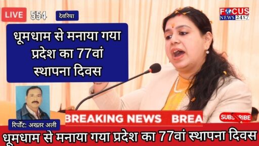 देवरिया, उत्तर प्रदेश के 77वें स्थापना दिवस के अवसर पर शनिवार को राजकीय इंटर कॉलेज (जीआईसी), देवरिया परिसर में भव्य प्रदर्शनी, सांस्कृतिक कार्यक्रम एवं जनकल्याणकारी योजनाओं से संबंधित स्टॉलों का आयोजन किया गया। कार्यक्रम का शुभारंभ ग्राम्य विकास राज्यमंत्री श्रीमती विजय लक्ष्मी गौतम, भाटपारानी विधायक सभाकुंवर, सांसद सलेमपुर प्रतिनिधि राम प्रकाश यादव, भाजपा जिलाध्यक्ष भूपेंद्र सिंह, जिला उपाध्यक्ष भाजपा राजेश मिश्र तथा जिलाधिकारी श्रीमती दिव्या मित्तल ने दीप प्रज्वलन एवं मां सरस्वती के चित्र पर पुष्पांजलि अर्पित कर किया।