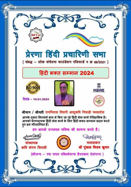 रामनिवास तिवारी आशुकवि, को मिला प्रेरणा हिंदी सम्मान 2024 ■रामनिवास तिवारी आशुकवि गढकुडार निवाड़ी मध्य प्रदेश को हिंदी राम भक्त सम्मान 2024 दिया गया निवाड़ी -…