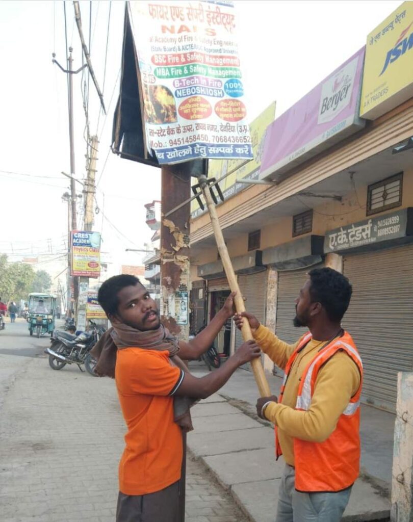 देवरिया जनपद के समस्त नगर निकायों में सड़कों के किनारे अवैध रूप से लगे होर्डिंग, फ्लैक्स तथा इससे जुड़े ढांचे के विरुद्ध अभियान चलाया गया।