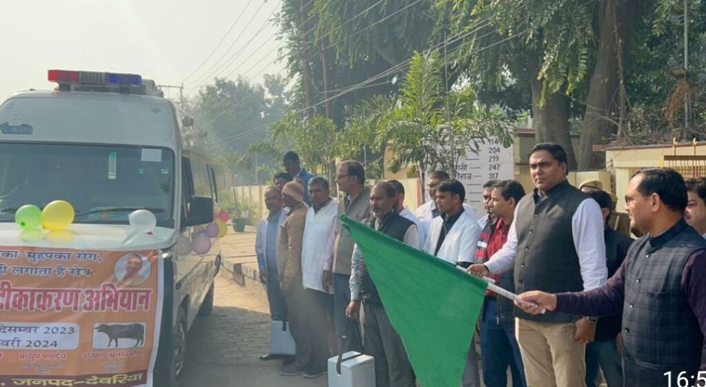 देवरिया जिलाधिकारी अखण्ड प्रताप सिंह ने राष्ट्रीय पशु रोग नियंत्रण कार्यक्रम अन्तर्गत खुरपका-मुंहपका टीकाकरण अभियान के तृतीय चरण का शुभारंभ कैम्प कार्यालय से जनपद के समस्त बहुउद्देशीय पशु चिकित्सा सचल वाहनों को टीकाकरण टीम सहित हरी झण्डी दिखाकर किया।