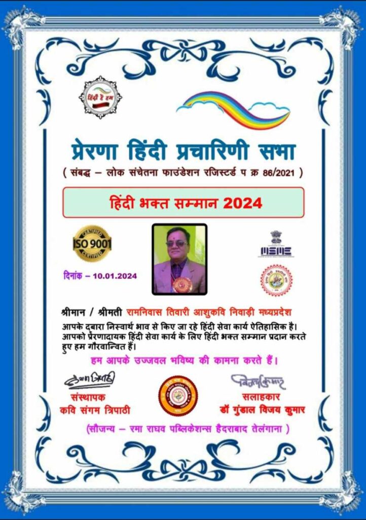 आज राष्ट्रीय संस्थापक कवि संगम त्रिपाठी ने इसी तारतम्य में ‘रामनिवास तिवारी आशुकवि “गढकुडार”निवाड़ी मध्य प्रदेश को” हिंदी राम भक्त सम्मान 2024 दिया गया है तथा बलराम द्विवेदी उमरिया,अजय पांडेय पत्रकार प्रतापगढ़ उ.प्र.हिन्दी सेवी सम्मान, रामगोपाल फ़रम्या मंदसौर,सुरेश विद्यार्थी, औरंगाबाद,को पत्रकारिता सम्मान, संतोष कुमार पांडे सुल्तानपुर रोहित मिश्रा राष्ट्रवादी संपादक बाराबंकी डॉक्टर नितिन मनोज अहमदाबाद को समाजसेवी सम्मान से सम्मानित किया गया डा गुडाल ,विजय कुमार, प्रदीप मिश्रा अजनबी,डा. हरेंद्र हर्ष,डा लाल सिह ये सभी हिंदी प्रचार प्रसार के लिए प्रयासरत हैं।।आशुकवि को प्रेरणा सम्मान 2024 मिलने पर निवाड़ी जिले के गणमान्य नागरिक एवं पत्रकारो ने बधाई देकर खुशी जाहिर की