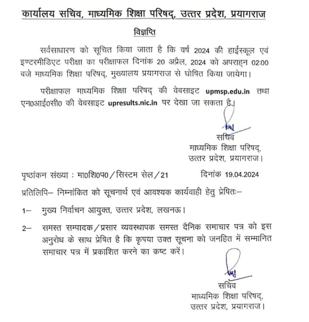 यूपी बोर्ड के सचिव दिव्य कांत शुक्ला ने जानकारी देते हुए बताया कि यूपी बोर्ड हाईस्कूल और इंटरमीडिएट का रिजल्ट कल 20 अप्रैल को घोषित करेगा. दोपहर 2:00 बजे यूपी बोर्ड मुख्यालय में हाईस्कूल और इंटरमीडिएट की परीक्षा का रिजल्ट घोषित किया जाएगा.